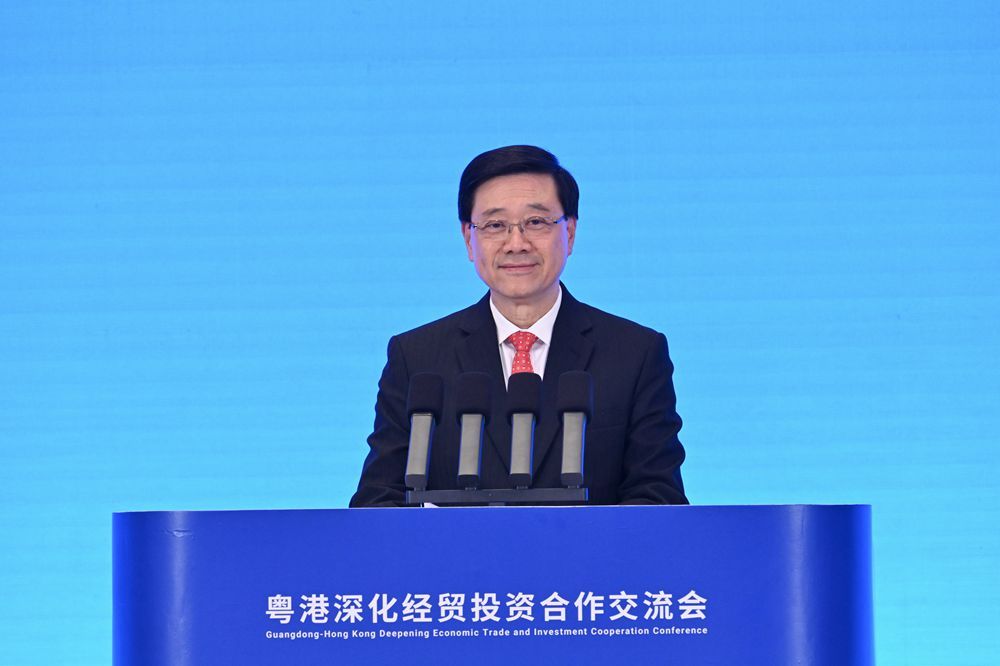 11月25日,香港特区行政长官李家超率领特区政府及工商界代表团到访广州。图为李家超在粤港深化经贸投资合作交流会致辞。