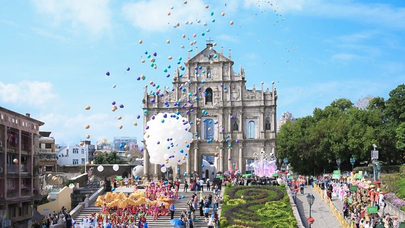 图为“2024澳门国际幻彩大巡游”在大三巴牌坊广场开幕。(图片来源:澳门特区政府新闻局供图)