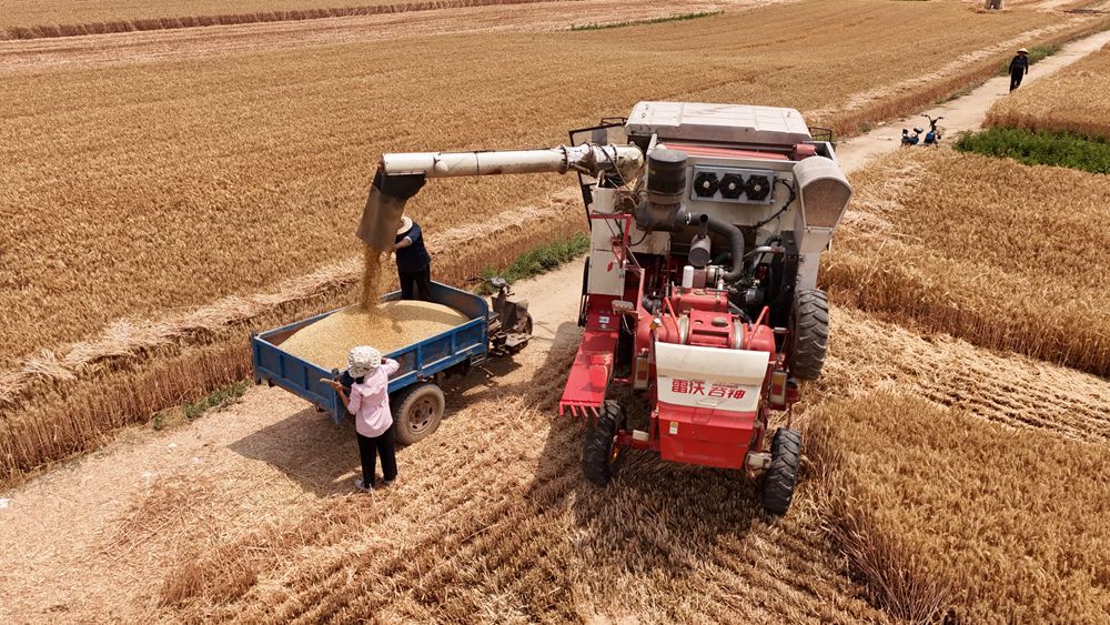 5月30日,河南省柘城县朱襄镇农民收获小麦。(图片来源:中新社)