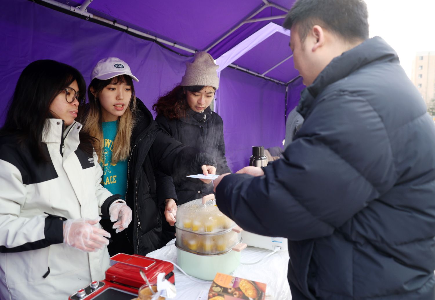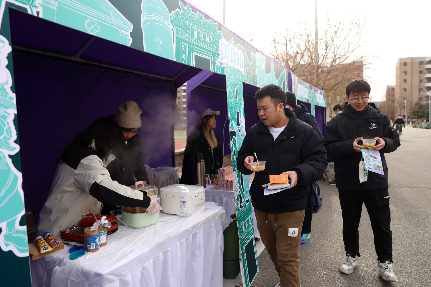 2024年12月19日,学生在北京清华大学校内展位前品尝澳门美食。 当日,为庆祝澳门回归25周年,北京清华大学举办澳门文化宣传日活动。 (图片来源:本文图片均由李大鹏摄)