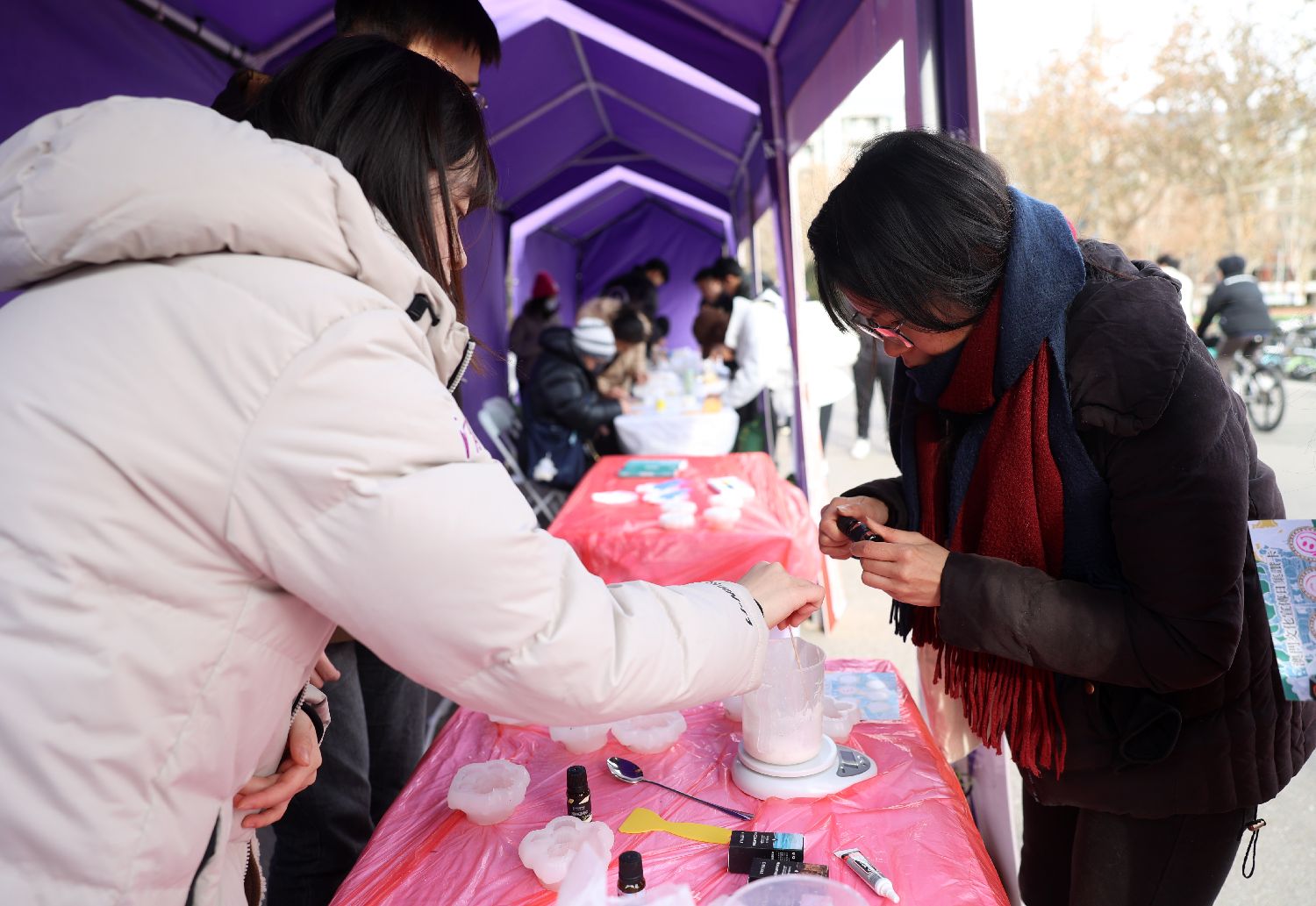 2024年12月19日,来自澳门的清华大学化学系博士庄美志(右)正在现场制作香薰。