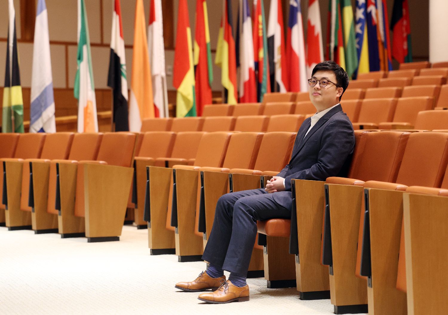 2024年12月19日,清华大学苏世民书院的全球事务研究生欧家骏在书院讲堂。