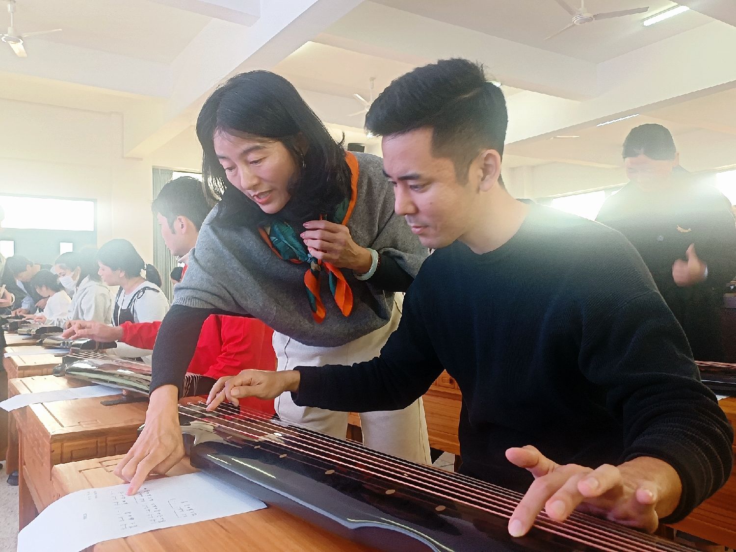 12月25日,“世界青年趣淘漳州”系列活动之日本青年古琴研习班在福建漳州开班。图为日本冲绳青年学生在老师的带领下学习古琴。