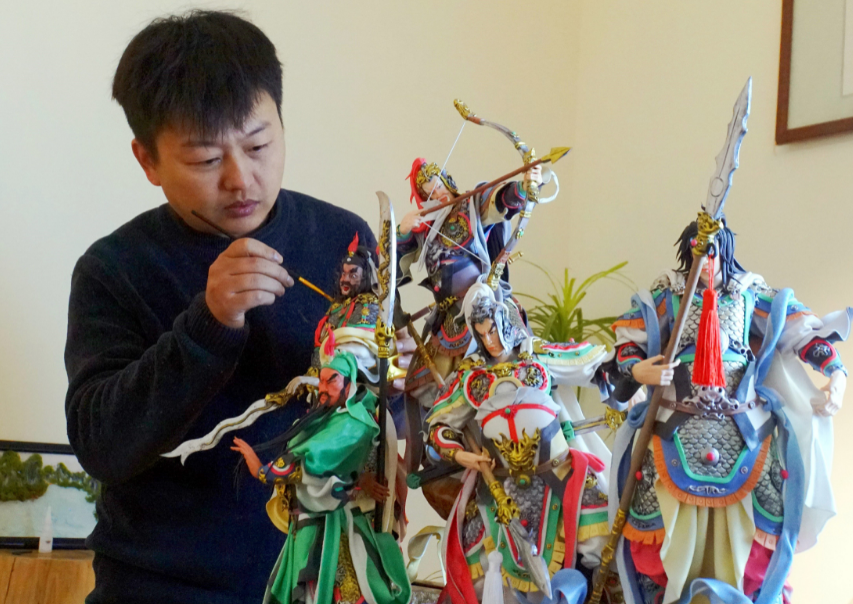 12月23日,周林泽为桂林面塑作品《五虎上将》做收尾工作。(图片来源:中新社)
