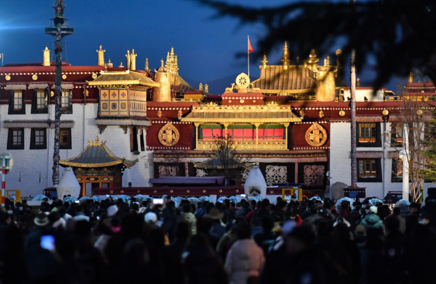 中新社报道,夜幕降临,拉萨八廓古城区的大昭寺周围人头攒动。信众们手持转经筒,围绕着大昭寺顺时针缓缓前行。他们口中念念有词,诵经声此起彼伏,手中的转经筒不停转动。
