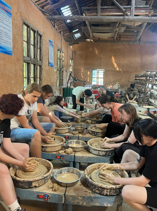 10月,来自江西科技师范大学的外国留学生研学团到靖窑体验拉坯等陶瓷技艺。(图片来源:受访者供图)