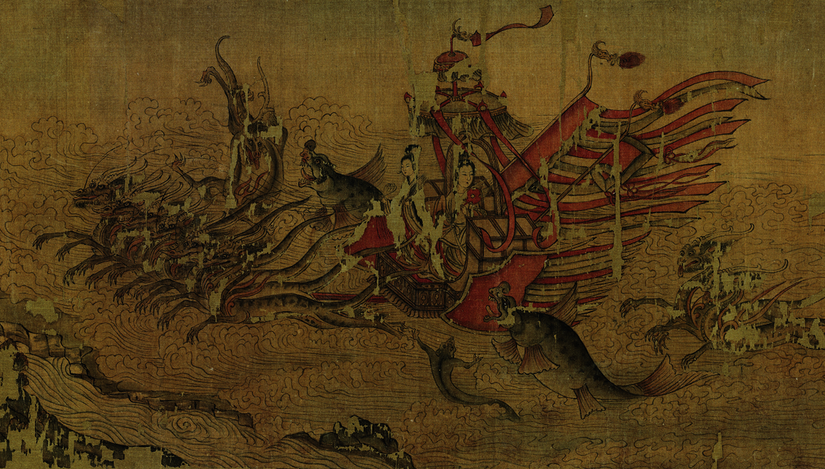 例如,在《洛神赋》中,“六龙俨以齐首,载云车之容裔。鲸鲵踊而挟毂,水禽翔而为卫。”这是描述洛神离开的场景。以此为依托,画者想象了洛神坐在六只龙驾驶的云车上回望人间,旁边鲸鲵等做护卫的场景,画面极具气势,场景震撼,可以看出画家丰富的想象力和高超的表现力。