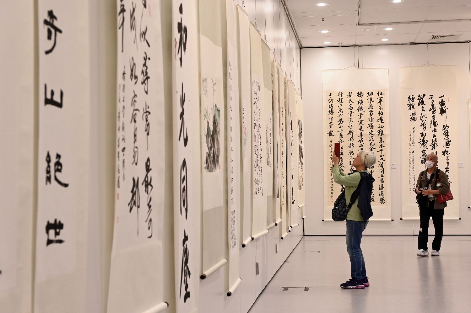 1月5日,由香港文学出版社主办的“四十芳华——《香港文学》四十周年志庆书画展暨作家手迹展”在香港中央图书馆展览馆举行。图为参观者在书画作品前驻足拍摄。(图片来源:中新社)
