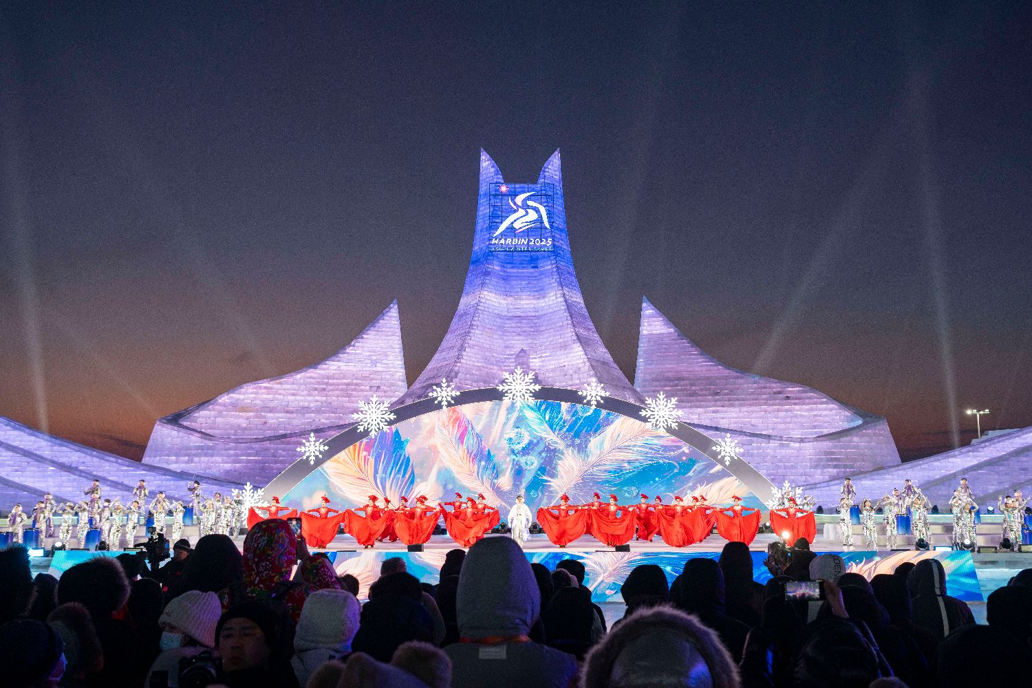 在哈尔滨冰雪大世界园区,人们5日观看第41届中国·哈尔滨国际冰雪节开幕式演出。(图片来源:新华社)