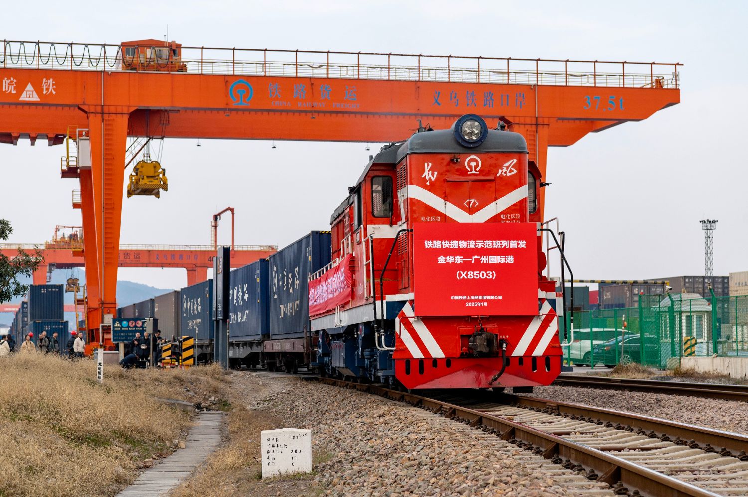 1月6日,长三角与珠三角间的首趟铁路快捷物流示范班列开行。示范班列载有27个集装箱货物,从铁路义乌西站开出,接续金华的货物列车后,驶向广州国际港。