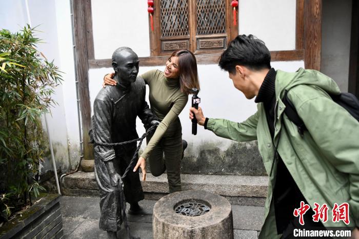 图为国际旅游达人与福州传统人物雕塑合影留念。