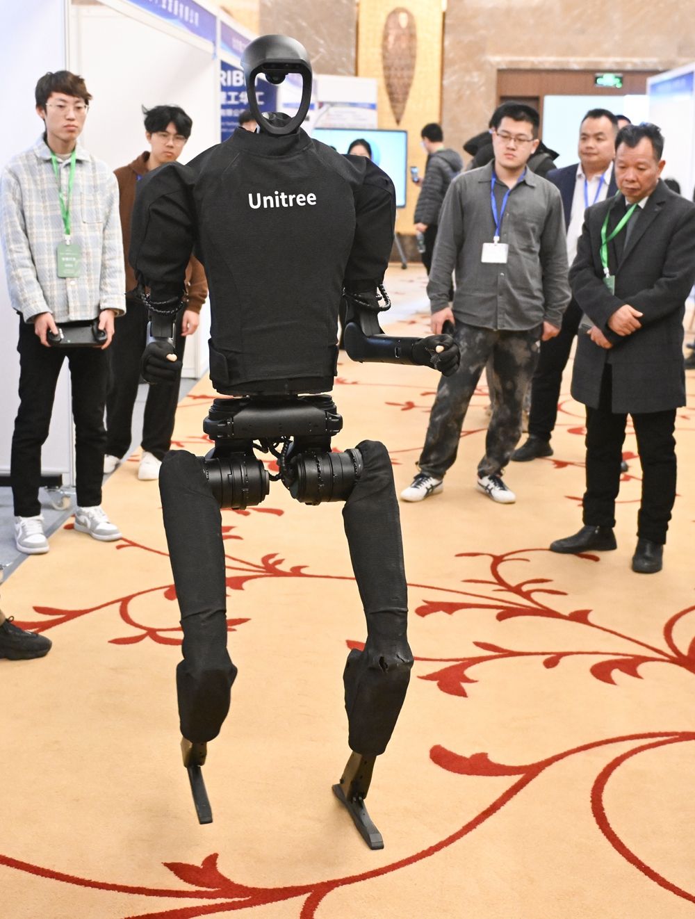 2024年3月13日,人形机器人大赛在北京经济技术开发区开赛,图为工作人员向参观者展示一款人形机器人。