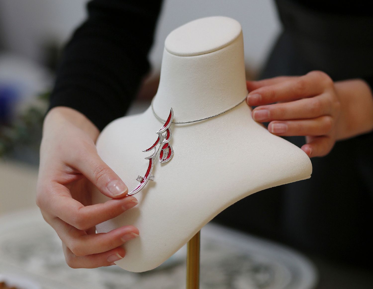 近日,湖南长沙,设计师展示用女书中“福”字设计的首饰。(图片来源:中新社)