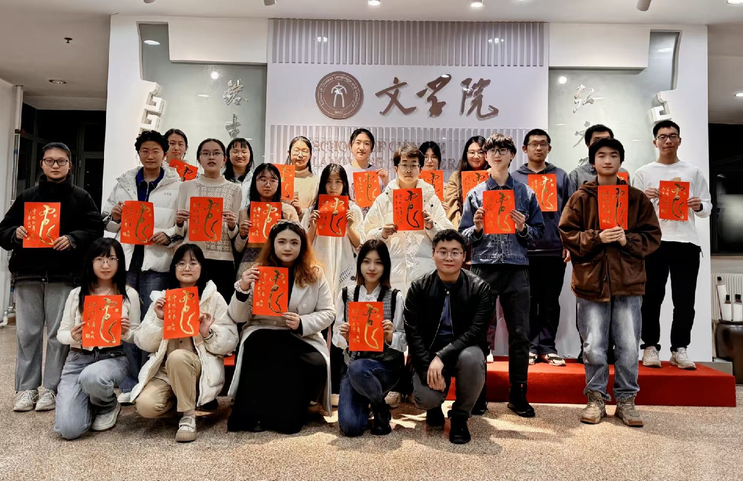 乙巳蛇年的脚步越来越近,北京师范大学文学院里满是红火的年味。各面玻璃、书柜贴着琳琅满目的“新桃”,当中有张稍显抽象的图案,略懂书法的人看到它往往会心一笑——一张化用了甲骨文、金文、小篆元素的“蛇”字,侧边写着“灵蛇起舞万象更新”。
