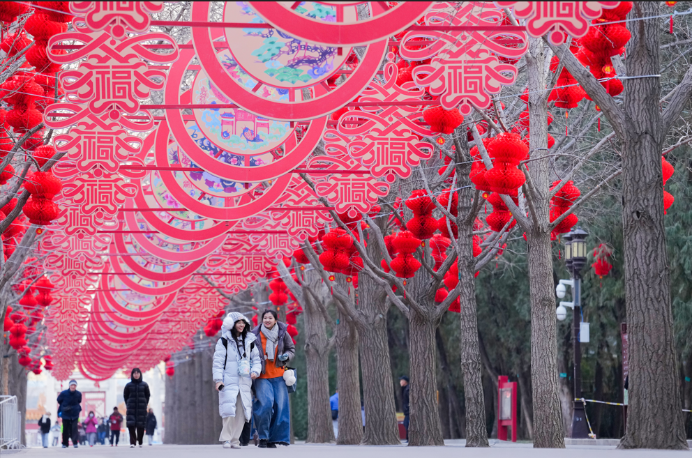 1月17日,北京地坛公园张灯结彩,市民从春节装饰下经过。(图片来源:中新社)
