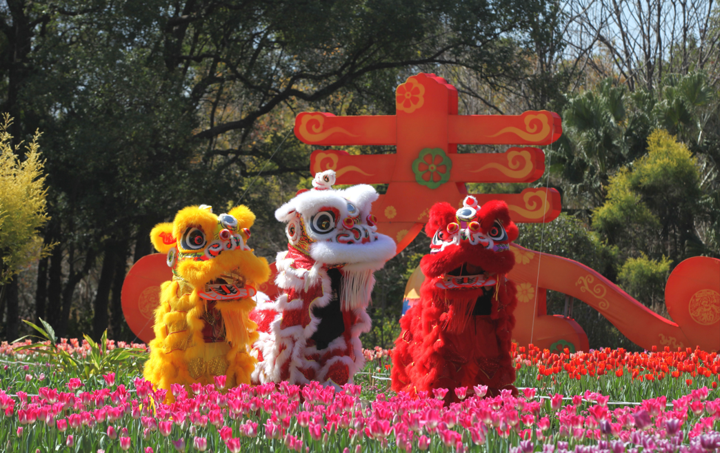 1月27日,2025桂林新春郁金香花展在訾洲公园开展,图为舞狮队在花展上表演。李腾钊摄