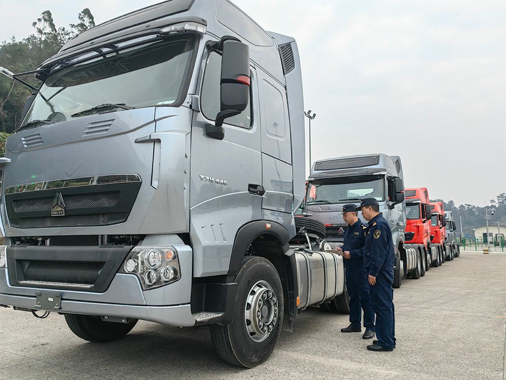 1月,友谊关海关关员检查准备出口的牵引车。(图片来源:中新社)