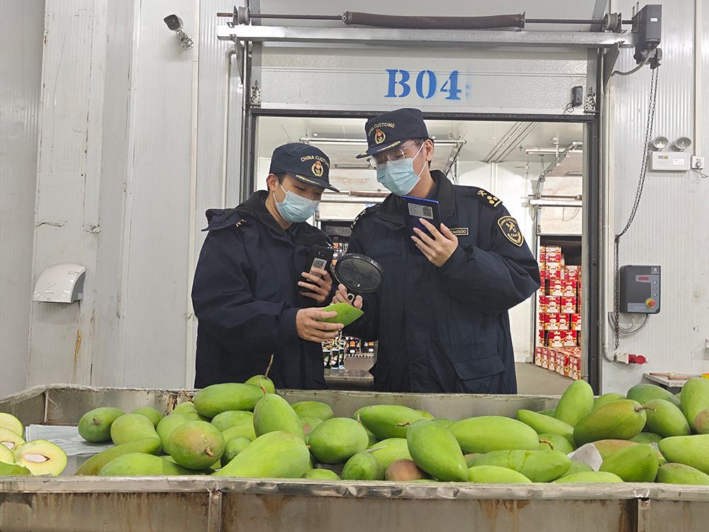 1月,友谊关海关关员查验进口水果。(图片来源:中新社)