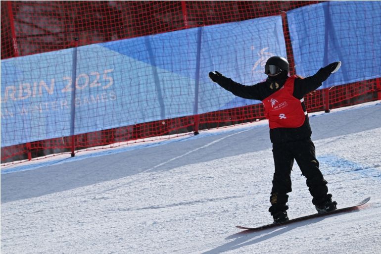 在2月8日举行的哈尔滨亚冬会单板滑雪女子坡面障碍技巧决赛中,中国队选手张小楠斩获金牌。(图片来源:中新社)