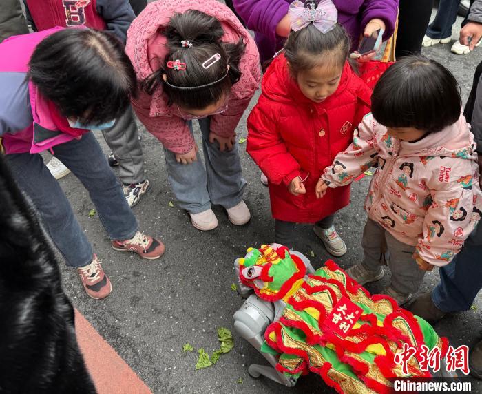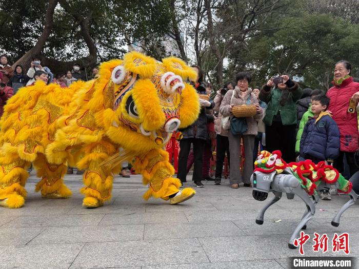 图为机器狗与传统舞狮互动闹元宵,吸引民众观看。