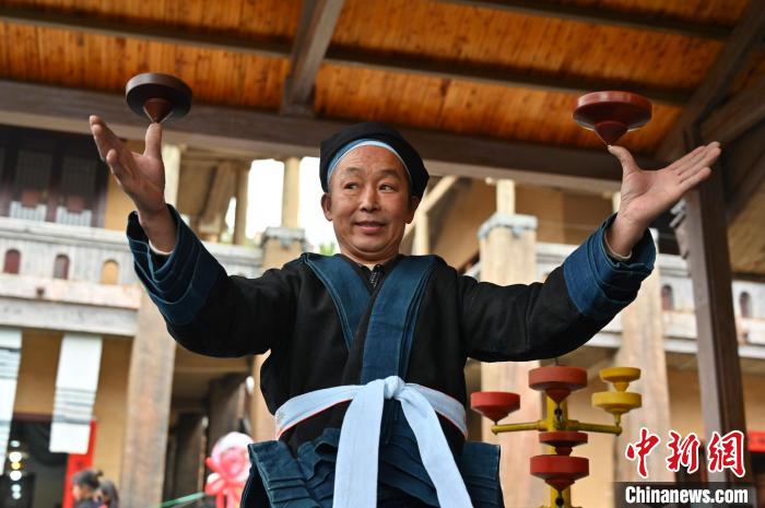图为白裤瑶艺人展示“指尖”陀螺绝活。