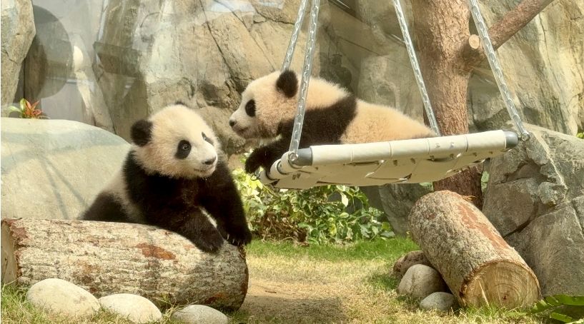 亮相仪式后,香港海洋公园组织传媒预览。在“大熊猫之旅”馆,记者见到正在玩耍的“家姐”和“细佬”。记者观察到,“家姐”毛发浓密,黑眼圈尾部微微翘起,透着几分灵动。“细佬”身形圆润,好似黑白相间的毛绒团子,黑眼圈圆润可爱,与圆滚滚的身材相得益彰。