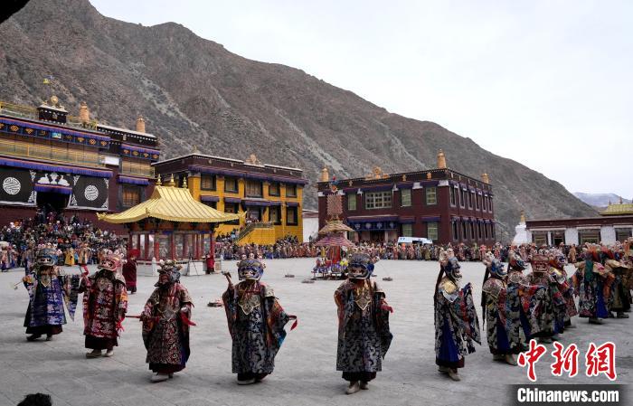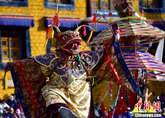 图为楚布寺僧人们佩戴面具参加跳神活动。(图片来源:本文图片均来自中新网)