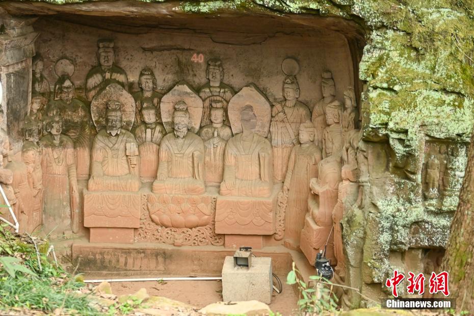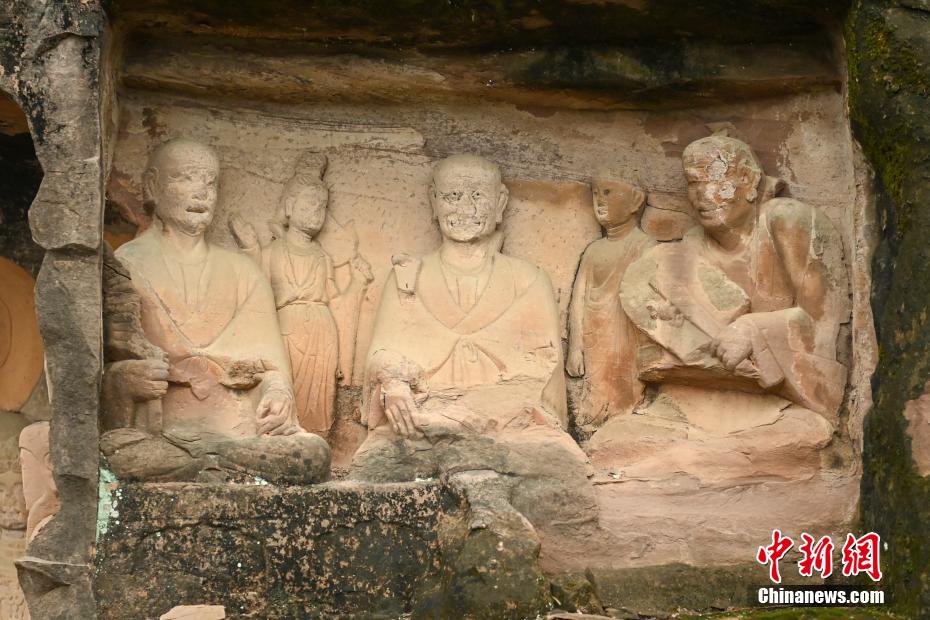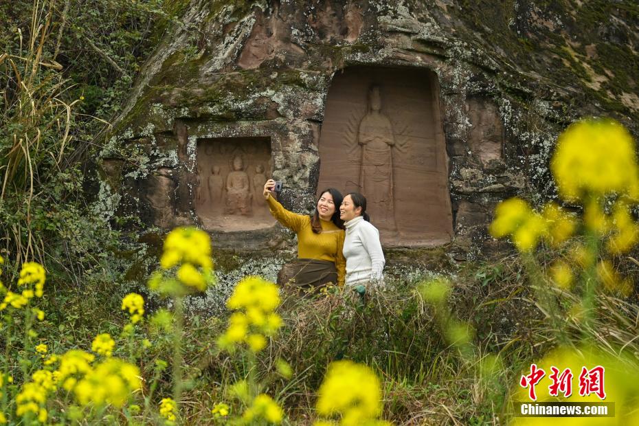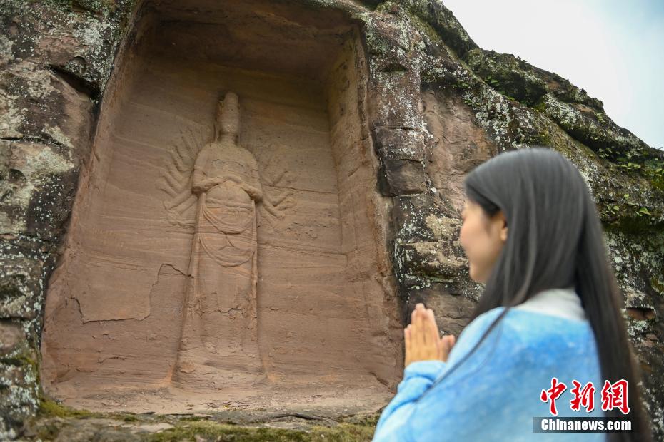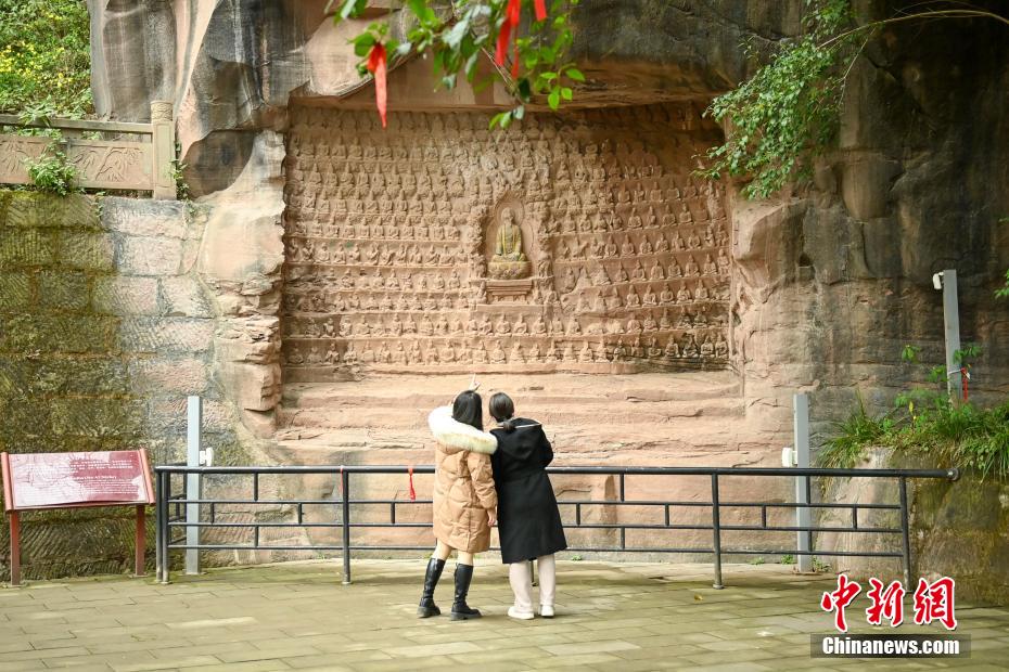 石窟群位于龙泉山脉中段东侧边沿,由观音堂、坛神岩造像群和玉皇庙三部分组成,已编号建档101龛,1519尊。图为游客驻足欣赏镌刻精美的“千佛”。(图片来源:本文图片均来自中新网)