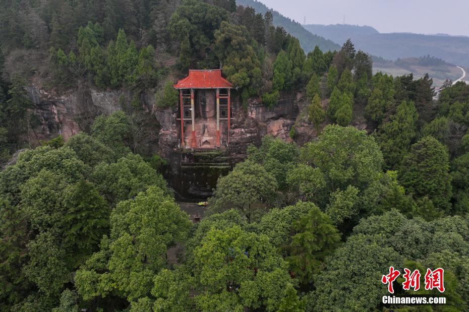 其中,牛角寨大佛是石窟中体量最大的一尊造像,大佛头高7.7米,颈高1米,胸高4.85米,面部宽4.6米,肩宽11米,工程布局、人物形态与乐山大佛极为相似,也是中国大佛中唯一一尊胸佛。图为航拍藏在山林中的牛角寨大佛。