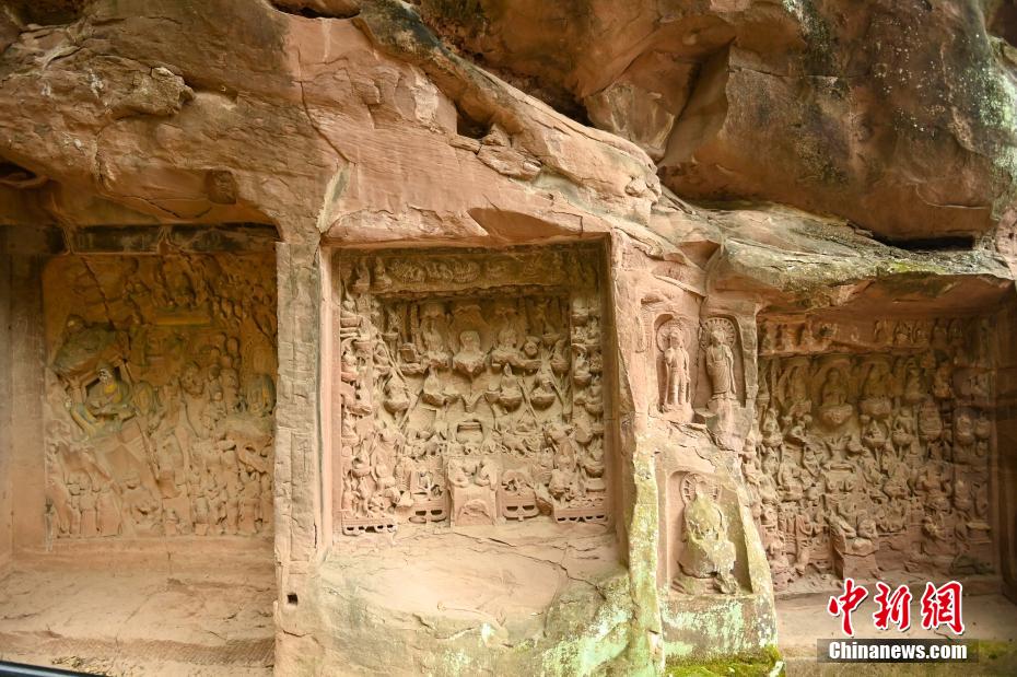 图为摩崖石刻造像群中的维摩诘经变龛,全龛刻像109身,除部分头部残损外,其余保存基本完好。