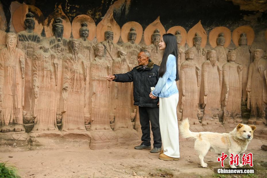 图为守护牛角寨摩崖石刻造像群的73岁黄天明(左)给游客介绍坛神岩并列真人群像龛的保护故事。