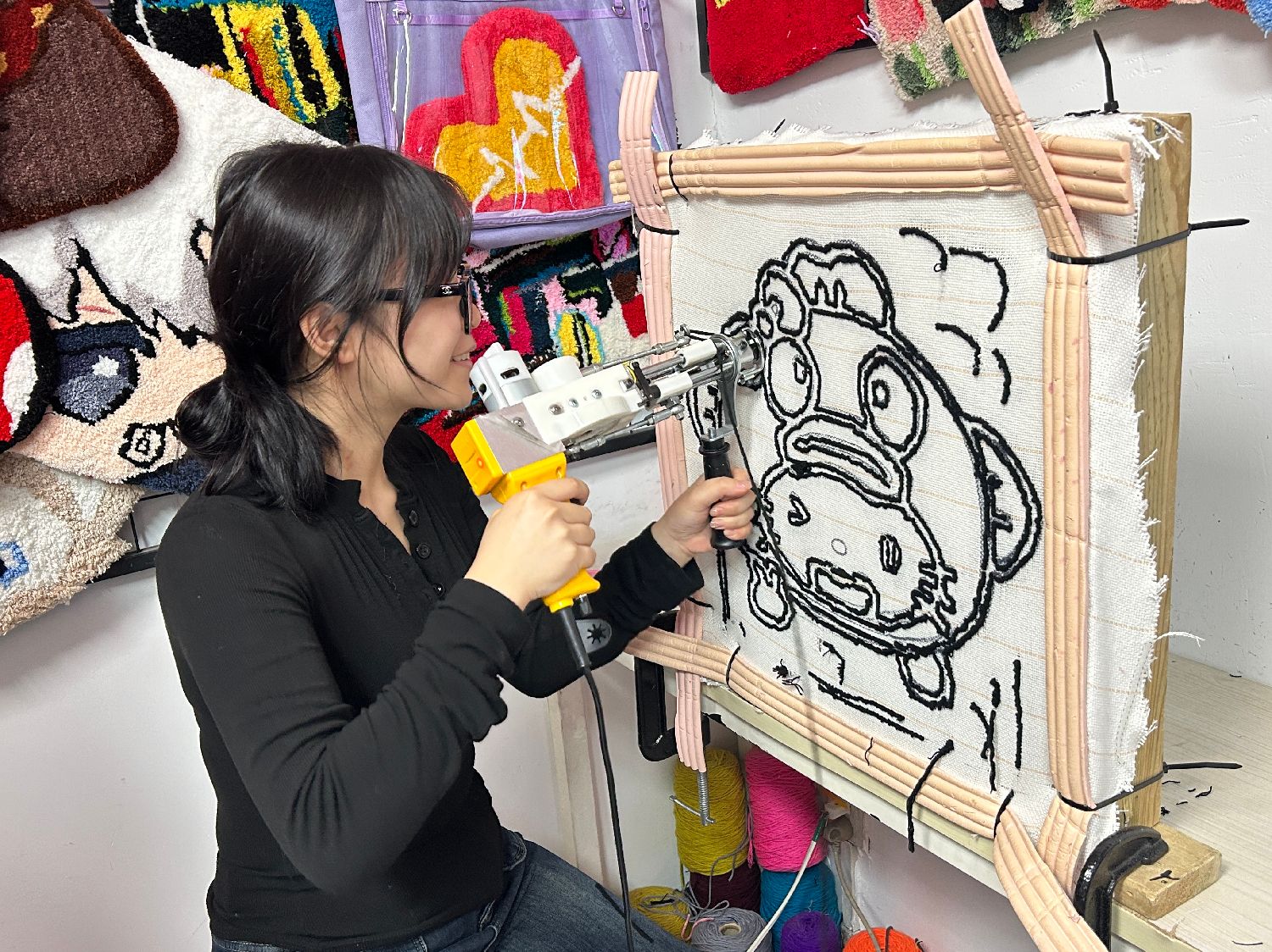在快节奏的都市生活中,一些年轻人选择放下手机,拾起钩针与簇绒枪,用一针一线编织生活的“减速带”。钩织(Crochet)是一种使用钩针将线材编织成各种形状和图案的传统手工技艺,通过不同的针法可以创造出丰富多样的纹理和作品。而簇绒(Tufting)则是通过特殊的簇绒枪将毛线或绒毛固定在画布上,形成毛茸茸的图案和装饰品。如今,这两项手工技艺,正成为年轻人寻找内心松弛感的“良方”。