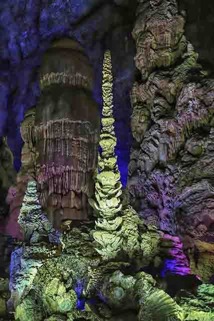 织金洞内的“地球之花”银雨树,形成大约有15万年,分塔状石笋、松球状石笋、花瓣状石笋三个阶段,是株高17米、重达40吨的罕见棕榈状石笋,以其结晶方解石构成的56层年轮,向人类传递着第四纪冰川期的气候密码,成为地球演化史珍贵档案的生动写照。