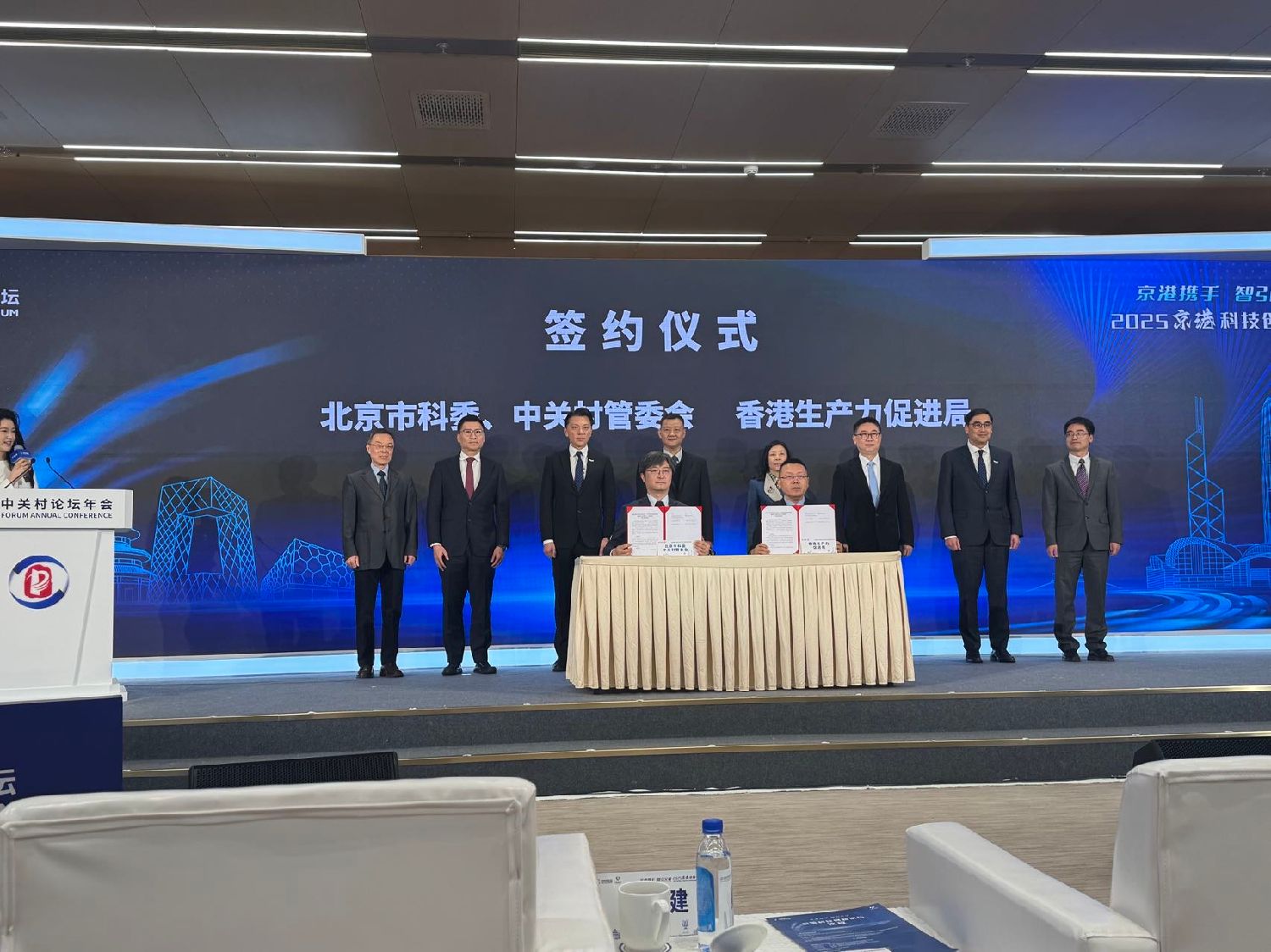 2025中关村论坛年会“京港科技创新论坛”暨第八届“京港青创杯”创业大赛北京选拔赛上,北京市科委、中关村管委会与香港生产力局签署框架合作协议。(图片来源:朴落沐 摄)