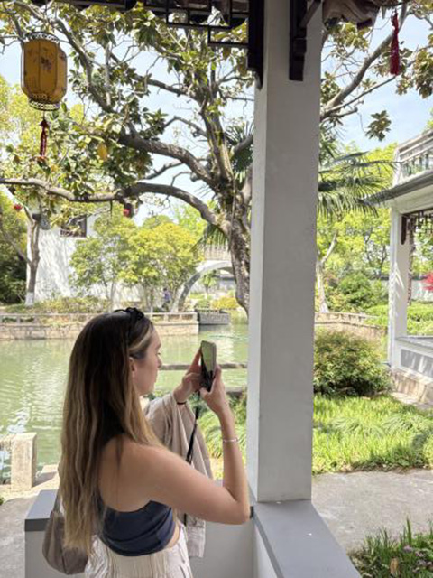 漫步片刻后,国际青年们收到了导游精心准备的透卡。他们纷纷举起透卡,框住他们眼中的江南水乡。古旧的石桥横跨在悠悠河道上,桥下小船摇曳,远处白墙黑瓦的建筑错落有致,在透卡的框景中,构成一幅幅绝美的画面。来自英国的Eve Palmer兴奋地说:“透过这小小的透卡,江南水乡的美好像被定格了,每一处都是那么迷人,随便一拍都能当明信片!”