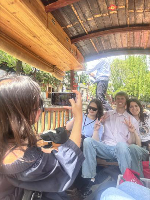 随后,青年们体验了手摇船项目。坐在缓缓前行的小船上,听着船桨划水发出的吱吱呀呀声,微风轻拂面庞,两岸的绿树、古宅缓缓后退。他们惬意地欣赏着沿途风景,沉浸在这份闲适之中,仿佛时光都慢了下来。