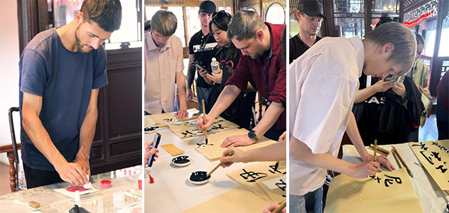下午,在老师的带领下,青年们迎来了丰富的文化体验活动。他们首先尝试了拓印技艺,亲手感受古老技艺的神奇。在老师的指导下,小心翼翼地将宣纸覆盖在石碑上,用墨轻轻拍打,不一会儿,石碑上的文字和图案便清晰地呈现在宣纸上。当看到自己印出的精美图案时,青年们脸上洋溢着惊喜与自豪。紧接着,大家拿起毛笔,在纸上学写自己的中国名字。尽管握笔姿势有些生疏,但他们认真专注,一撇一捺间满是对中国文化的热爱。