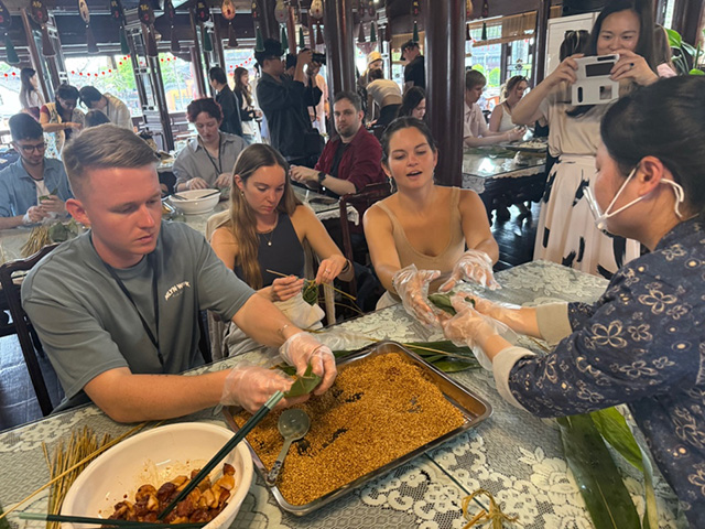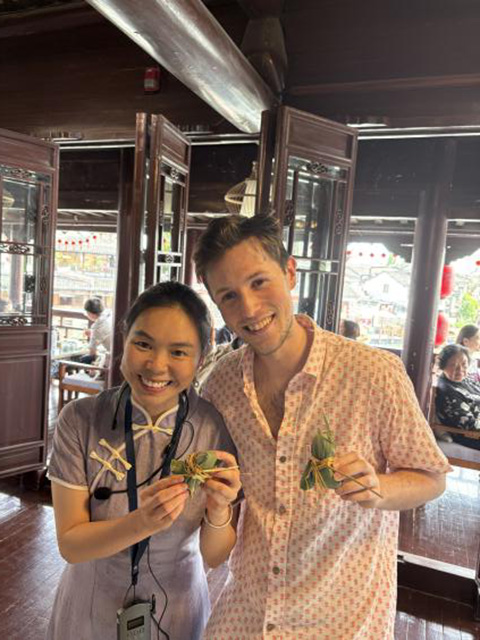青年们还参与了包粽子活动。糯米、粽叶、红豆在他们手中翻转,虽然一开始包出的粽子形状各异,但在互相学习和帮助下,逐渐有了模样。现场欢声笑语不断,氛围十分融洽。“以前只在书本上了解过端午节,这次亲手包粽子,感觉对这个节日有了更深刻的认识,太有意思了!”Leo Nasskau开心地说道。