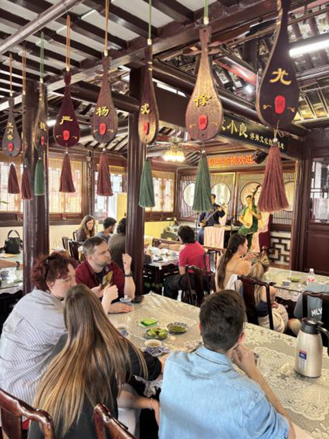 劳动之后,青年们围坐在在古色古香的茶馆里,聆听苏式弹唱。婉转的吴侬软语、悠扬的丝竹之音,如潺潺流水般流淌在空气中。青年们沉浸其中,尽管他们大多听不懂唱词,但那美妙的旋律和表演者投入的神情,让他们深深感受到了苏式弹唱的独特魅力。