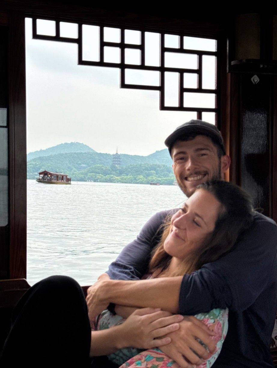 情侣博主Lisandra与Pol在西湖游船上相拥。(图片来源:余佳颖摄)