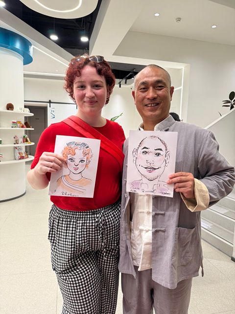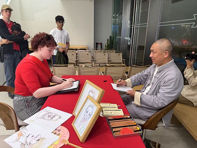 英国女生Izzy和杭州漫画家现场互为对方画肖像漫画。(图片来源:余梁意摄)