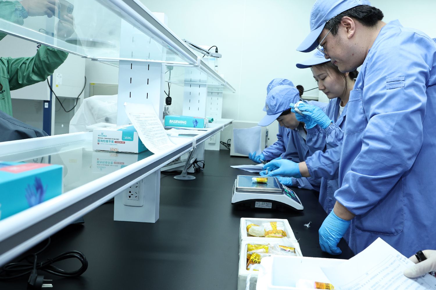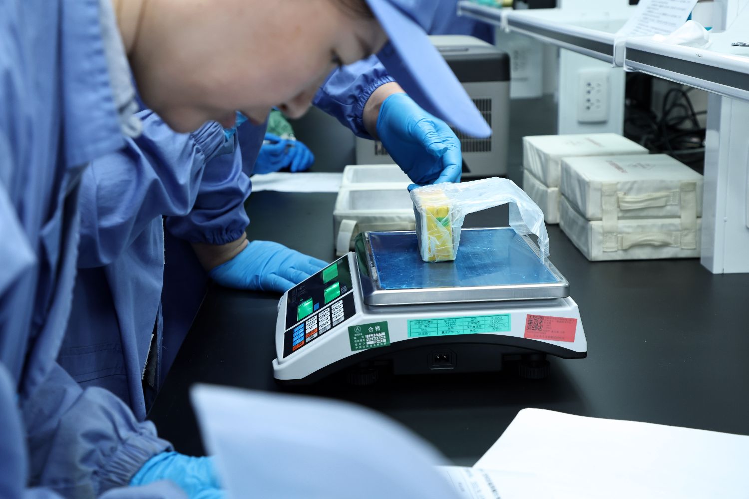 4月30日晚,北京,工作人员对从中国空间站返回的生命类科学实验样品进行状态检查确认并称重。(图片来源:中国科学院空间应用中心供中新社图)
