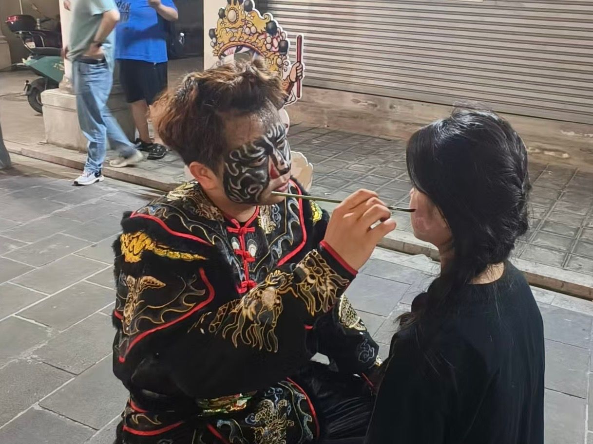 英歌舞队员5月2日在汕头小公园开埠区“学英歌·集五福”活动上为游客免费绘制英歌舞脸谱。(图片来源:中新社)