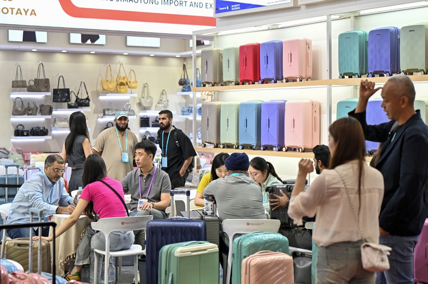 5月1日,在广东广州,境外采购商在第137届广交会第三期箱包展区与参展商洽谈。(图片来源:中新社)