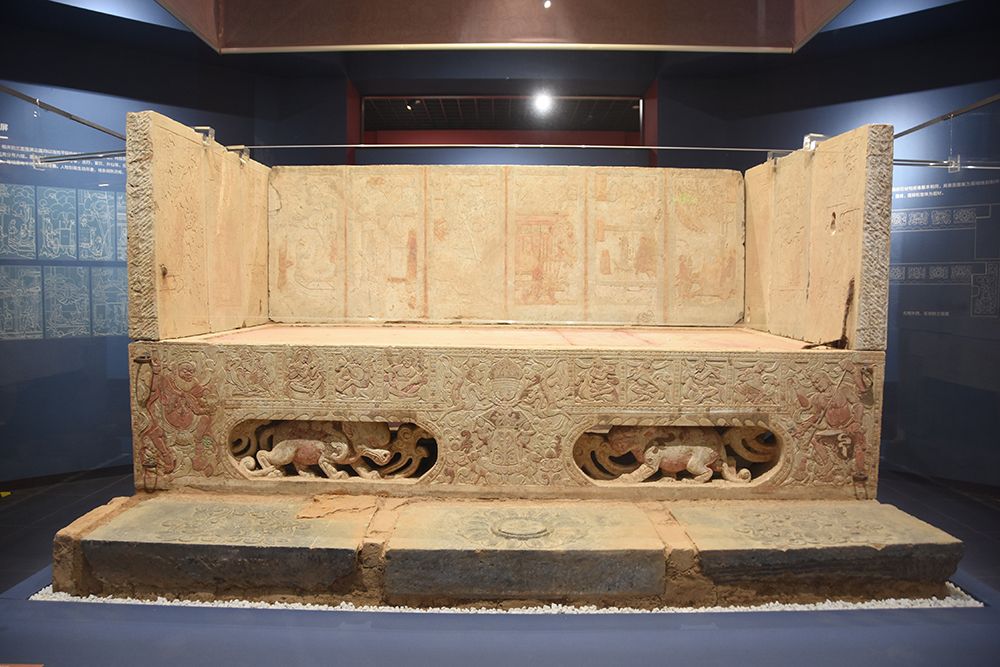 2月27日,河南安阳博物馆“丝路遗韵相州风——麴庆墓出土文物展”围屏石棺床正在展出。(图片来源:中新社)
