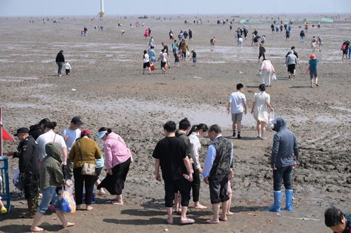 “现在是文蛤最肥美的时节,我们一家人专程来体验'寻宝'的乐趣。”游客李女士介绍,一直听说小洋口“海上迪斯科”项目很解压,没想到今年又添了新项目,除了采文蛤、打排球、踢足球,还能水塘摸鱼、开沙滩车,孩子玩得很开心。
