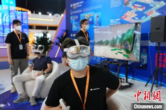 2023年6月15日,第二十九届北京国际图书博览会在北京国家会议中心举办,共有56个国家和地区前来参展,展商数量超过2500家。图为观众在本届图博会首设的网络出版馆体验VR设备。