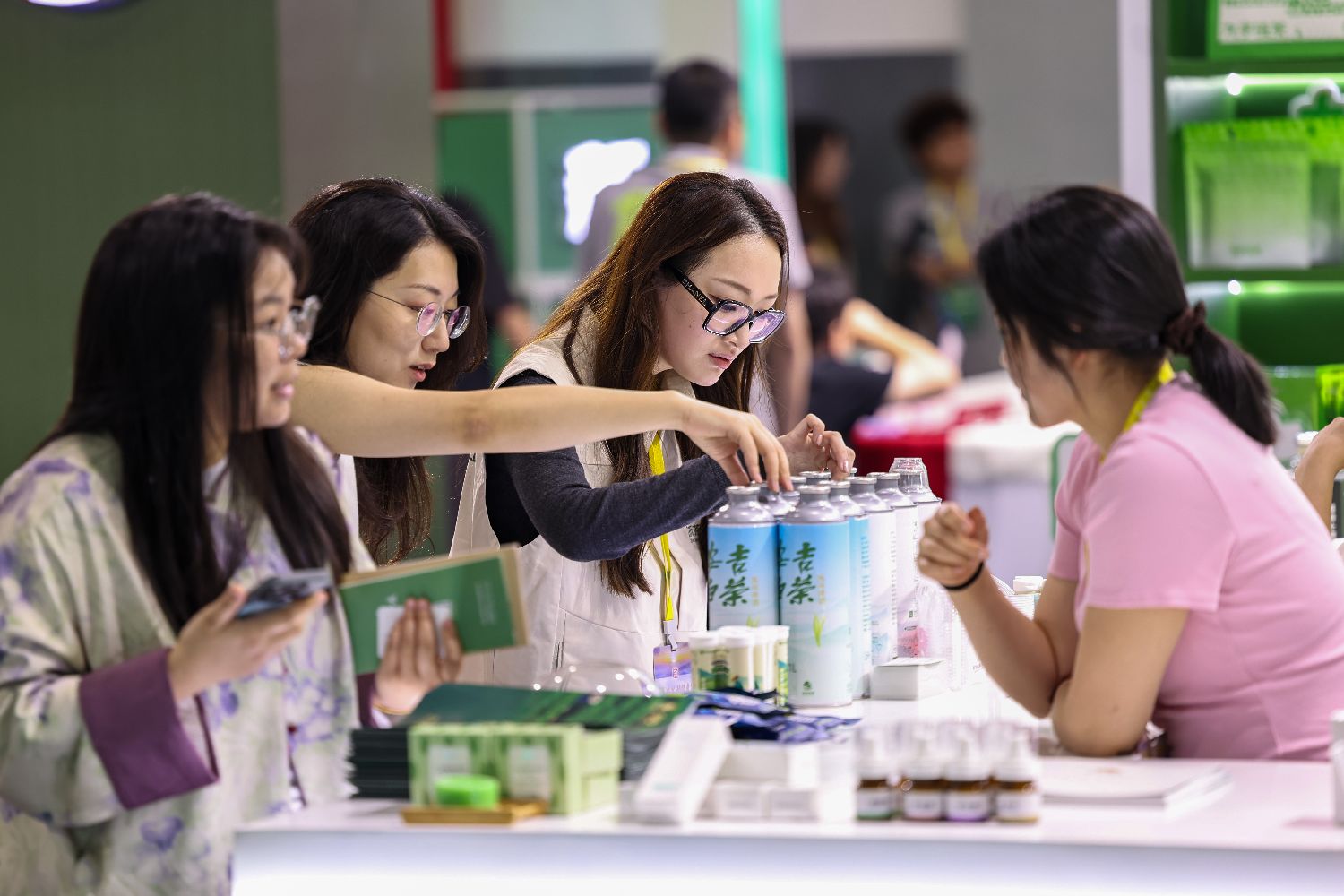 本届国际茶叶博览会展出了来自中国十余个茶叶主产区的各类茶叶以及茶饮、茶器,在展会期间还举行了2025年浙江省龙井茶炒制技能大赛。图为5月21日,观众在第七届中国国际茶叶博览会现场挑选安吉白茶茶饮。(图片来源:本文图片均据新华社)