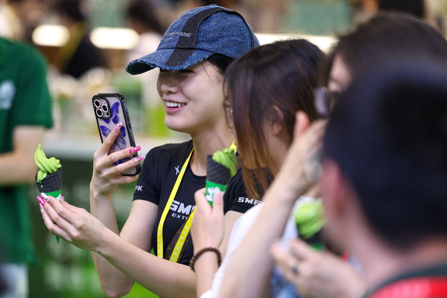 5月21日,观众在第七届中国国际茶叶博览会现场品尝抹茶冰激凌。