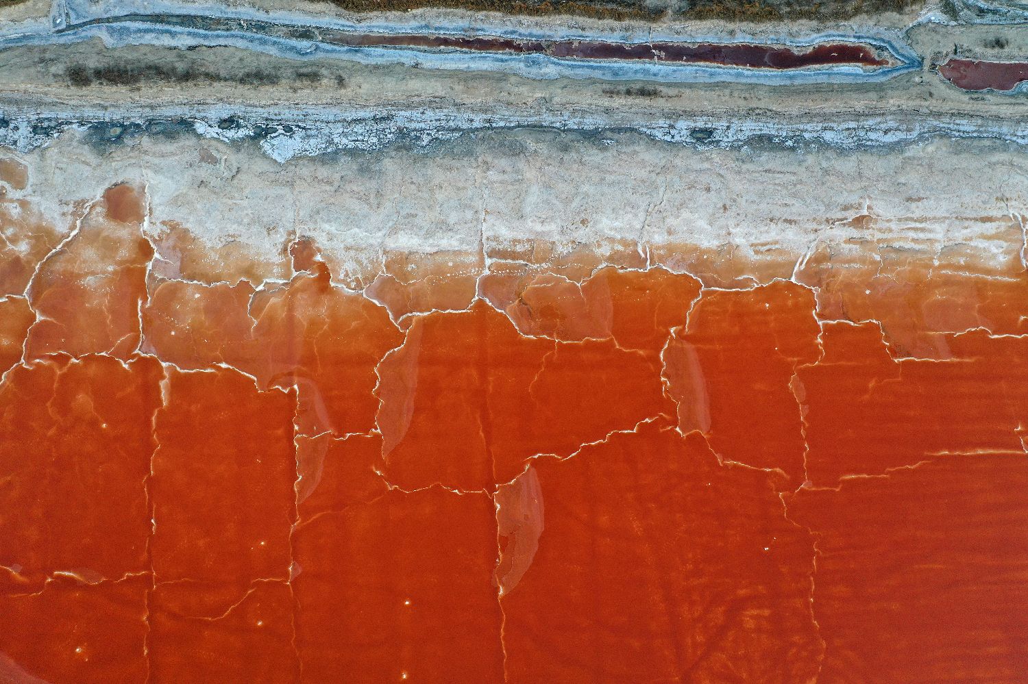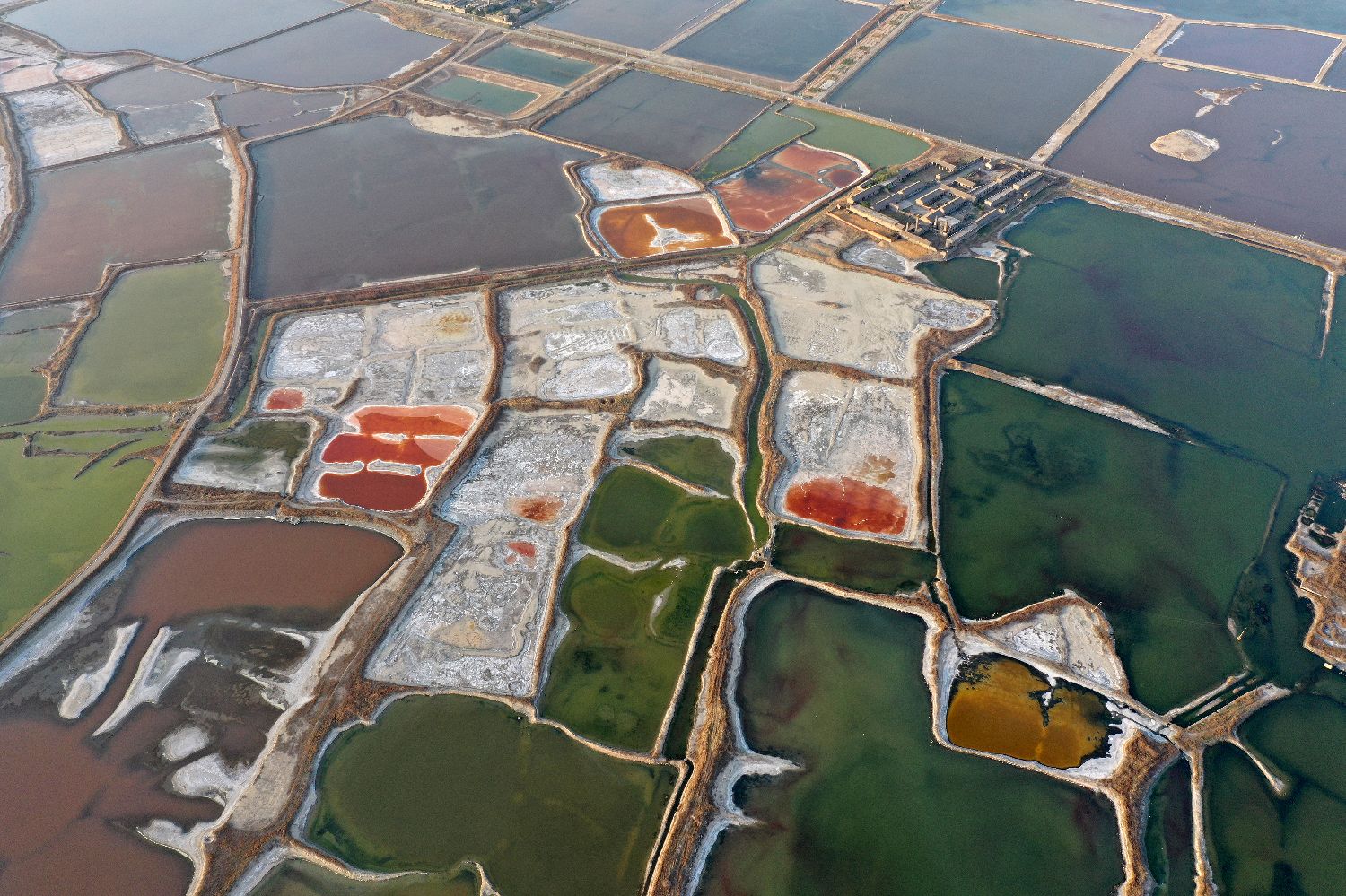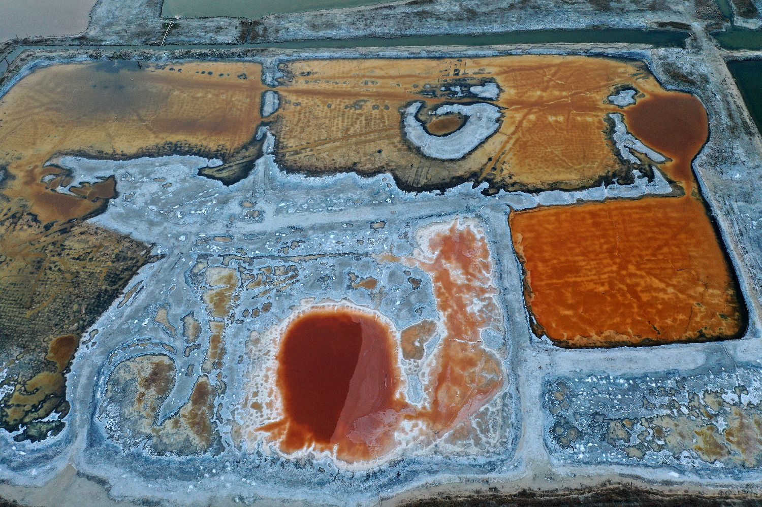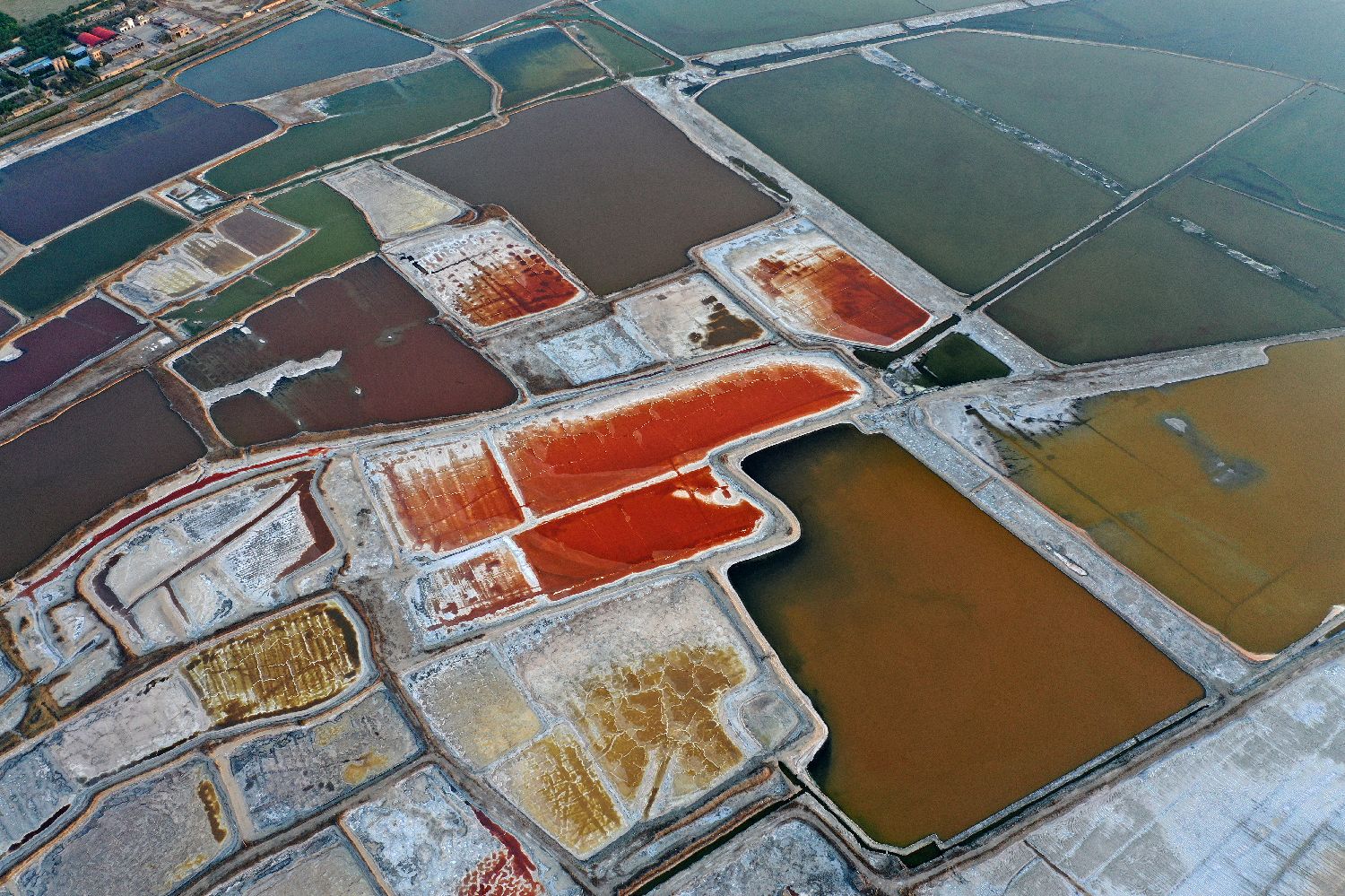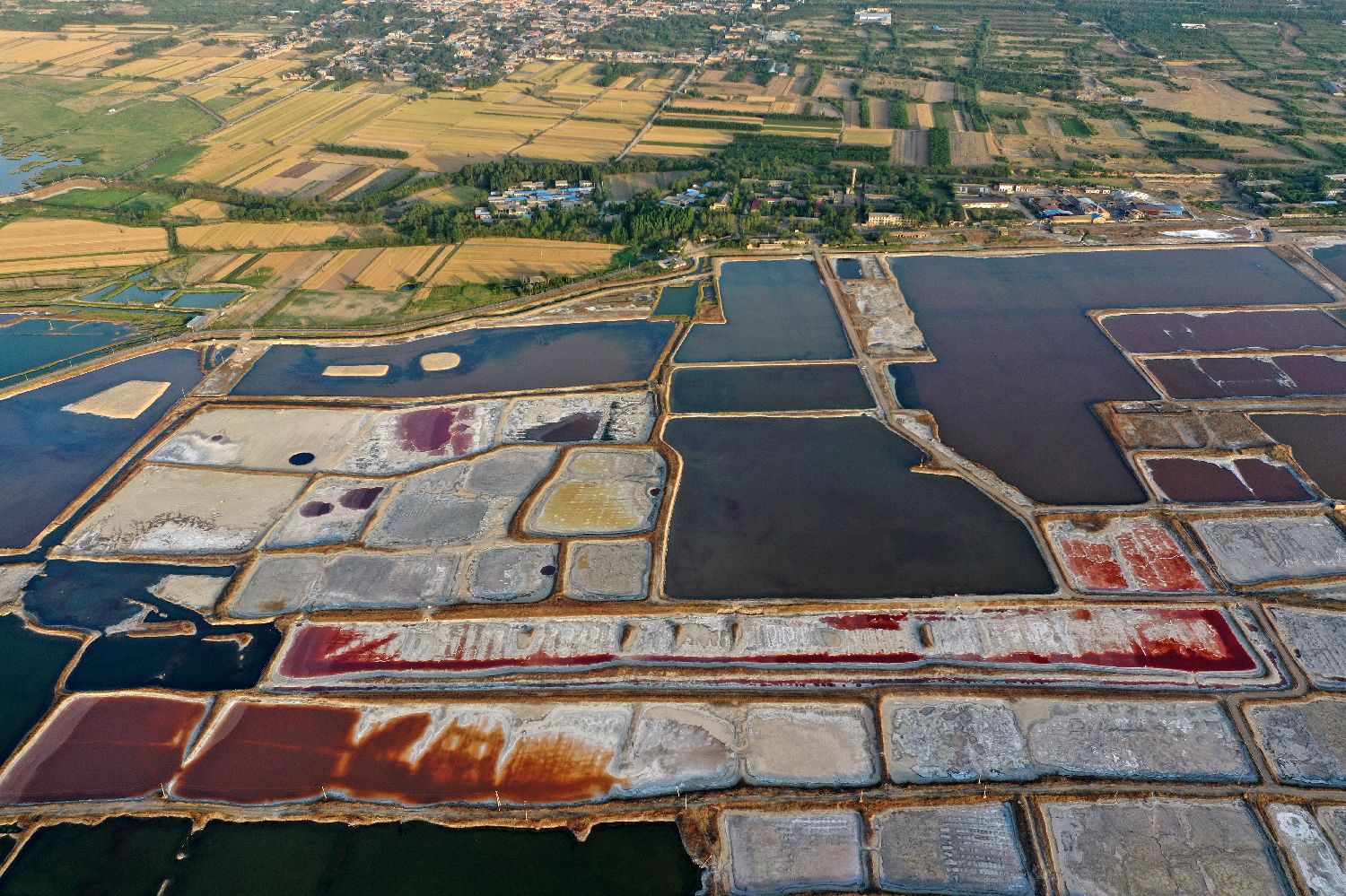 连日来,随着气温持续升高,位于山西南部的运城盐湖呈现出色彩斑斓的景象,从空中俯瞰,如同一块块散落在大地上的调色盘。